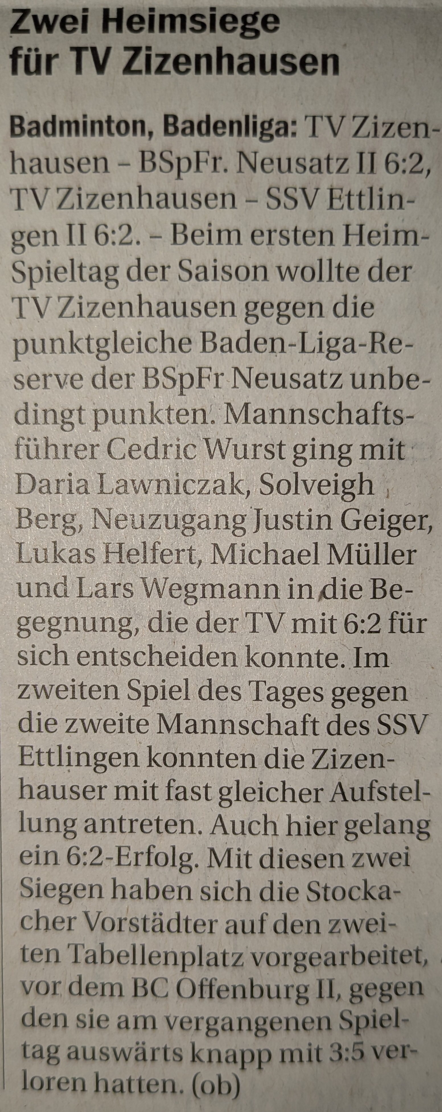 TV Zizenhausen – BSpFr. Neusatz 2 6:2 Am vergangenen Wochenende bestritt der TV Zizenhausen den ersten Heim- Spieltag der Saison 2025/2026. Gegen die punktgleichen Gäste der Baden-Liga Reserve vom BSpFr Neusatz, wollten die Stockacher Vorstädter unbedingt punkten. Mannschaftsführer Cedric Wurst konnte an diesem Samstag mit der fast kompletten Mannschaft antreten. Mit dem jungen Nachwuchstalent Daria Lawniczak und Solveigh Berg, sowie Neuzugang Justin Geiger, Lukas Helfert, Michael Müller und Lars Wegmann ging man in die Begegnung. Im zweiten Spiel des Tages gegen die 2. Mannschaft des SSV Ettlingen konnten die Zizenhauser mit fast gleicher Aufstellung antreten. In den Auftaktmatches lief es dann perfekt. Das Damendoppel Daria Lawniczak und Solveigh Berg konnte sich nach hartem Kampf gegen Lindner/Kappenberger mit einem 22:20/21:19 Sieg belohnen. Im 1. Herrendoppel hatten dafür Cedric Wurst und Lukas Helfert gegen Schumacher/Bergande weniger Mühe und siegten mit 21:11/21:11. Auch im 2. Herrendoppel setzten sich Justin Geiger und Lars Wegmann gegen Geukes/Schmiederer mit 21:14/21:17 durch. Somit konnte man mit einer klaren 3:0 Führung in die weiteren Spiele gehen.